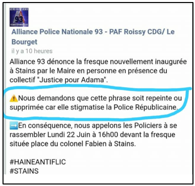 Le 21 juin dernier, soit trois jours après le jour de l’inauguration, l’édile publie un communiqué choqué et inquiet du fait qu’un « syndicat de police », à savoir la fédération du 93 d’Alliance, « appelle à un rassemblement et à recouvrir cette fresque » le lendemain, lundi. Cette provocation intolérable a de fait amené le collectif pour Adama à organiser un contre-rassemblement le même jour et sur le même lieu. Dans un tel contexte de tension, le drame devenait inévitable. Le maire a donc demandé avec insistance à la Préfecture du département de faire entendre raison au syndicat policier et de faire annuler le rassemblement.
