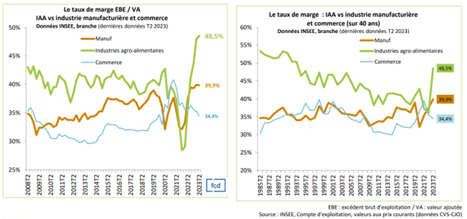 Au-delà des écarts de résultats et de revenus entre les agriculteurs, à chaque bout de la chaîne, les grands groupes industriels exploitent au maximum la concurrence sur le marché agricole pour générer des profits records, et reversés des dividendes à leurs riches actionnaires. En 2023, la marge des entreprises de l’industrie agroalimentaire est au plus haut depuis 1991, avec un pic d’évolution inégalé comme le montrent les graphiques ci-dessous.