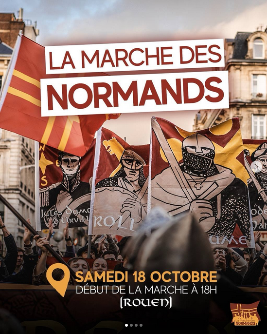 Samedi 18 octobre à Rouen se déroulait « la marche des Normands », sorte de commémoration historique dont l’objectif est de mettre en avant l’identité normande. Mais les références à l’histoire normande, notamment au passé Viking de la région peine à masquer que derrière cette commémoration se trouve une myriade de groupuscules xénophobes et autre identitaires d’extrême droite. Parmi eux, les très probables organisateurs, « Les Normaux », organisation fondée sur les cendres du groupe nationaliste et islamophobe Génération Identitaire qui avait été dissous par le gouvernement en 2021, après avoir mené des actions contre les migrants. Dans leur marche, Les Normaux ont été rejoint par des groupes venus d’autres villes.