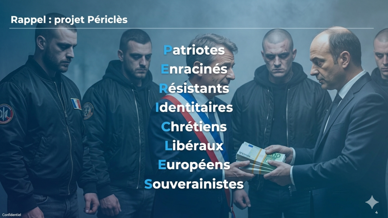 Son instrument principal porte un nom qui en dit long : Périclès. L’acronyme de ce projet est lui-même un programme : Patriotes, Enracinés, Résistants, Identitaires, Chrétiens, Libéraux, Européens, Souverainistes. Une synthèse idéologique où se mêlent nationalisme identitaire, catholicisme traditionaliste et défense acharnée du capital.